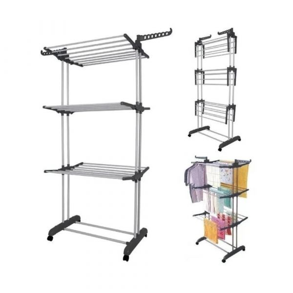 La estructura de tres niveles ofrece un amplio espacio para colgar prendas, maximizando la capacidad de secado sin ocupar demasiado lugar. Ideal para apartamentos, casas o incluso en espacios comerciales, este tender se coloca de pie, asegurando estabilidad y funcionalidad en todo momento.